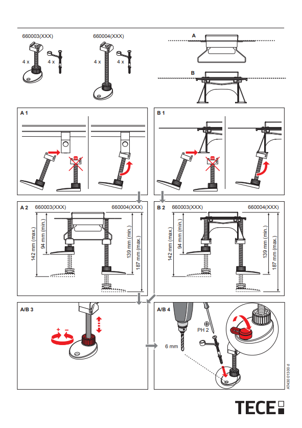 • TECEdrainline stelpootjes: 660003 (94–142 mm, geschikt voor “laag” en “normaal”)