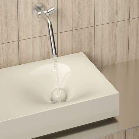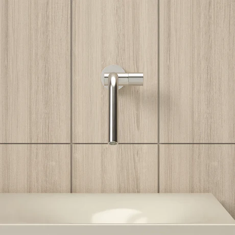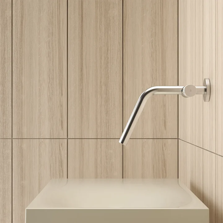 chroomkleurige afwerking die tijdloos en onderhoudsvriendelijk is. Deze afwerking benadrukt de zuiverheid van het ontwerp en zorgt voor een subtiel contrast met keramiek of natuursteen. Het oppervlak is gepolijst en bestand tegen dagelijks gebruik, wat de levensduur van de kraan verlengt en haar glans behoudt. Deze