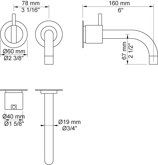 VOLA 111 wandmengkraan, Monoknop inbouwmengkraan met keramisch cartouche en vaste uitloop 160 mm met waterbesparende mousseur verkrijgbaar bij