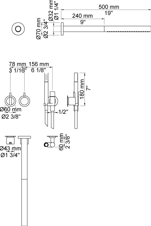 2471-081STAP = Bedieningsknop NR21, omstelknop NR24G, handdouche en houder 070, hoofddouche 080ST, rozetten Ø60 mm 001, 001G, 2001.