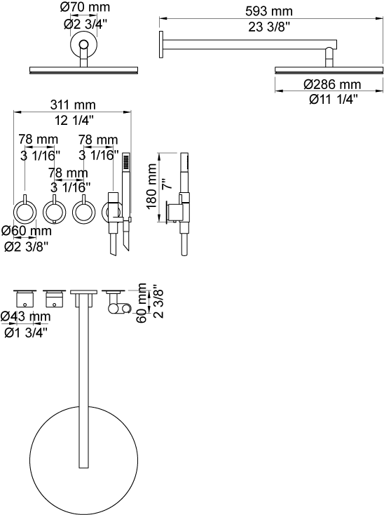 VOLA 5471R-061 doucheset, Inbouwthermostaatkraan met 2-weg omstel, naar handdouche met houder en regendouche, wandmontage verkrijgbaar bij