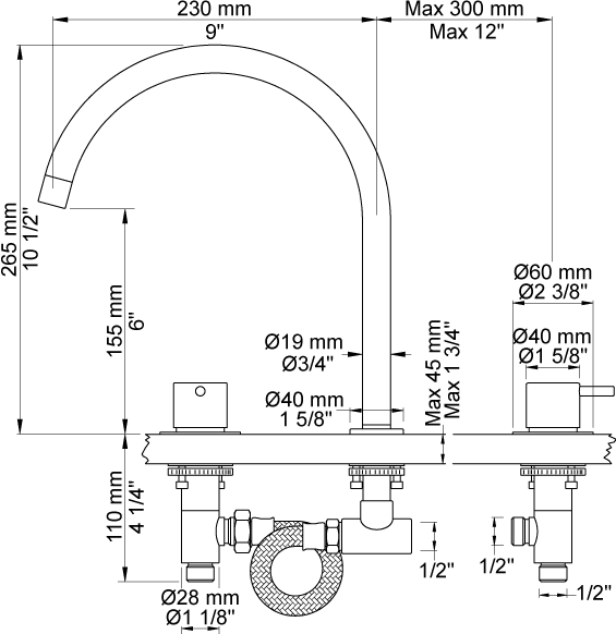 VOLA KV15 draaibare keukenmengkraan, duoknop mengkraan met keramische cartouches, bestaande uit stopkranen S50D + S50DH en draaibare uitloop 090H met waterbesparende mousseur, hoogte 265 mm, sprong 230 mm. Incl. aansluitset (flexibele slangen). verkrijgbaar bij Stone Company.